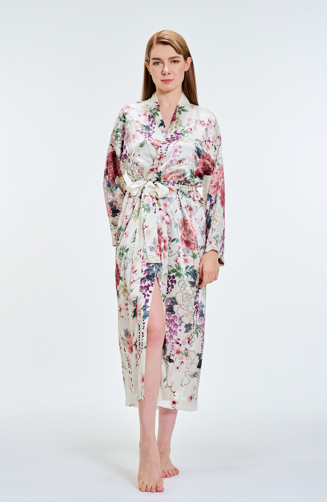 Experience the epitome of sophistication with our luxurious silk kimono robe from Wakana Fabric. Inspired by the traditional Japanese kimono, this silk robe is meticulously tailored to infuse an essence of Japan's rich cultural heritage into your wardrobe. Our unique designs merge timeless elegance with modern style, making this silk kimono robe an essential addition for those who cherish life's finer details. Ideal for adding a touch of refined elegance to any look, this robe perfectly balances tradition and contemporary fashion.